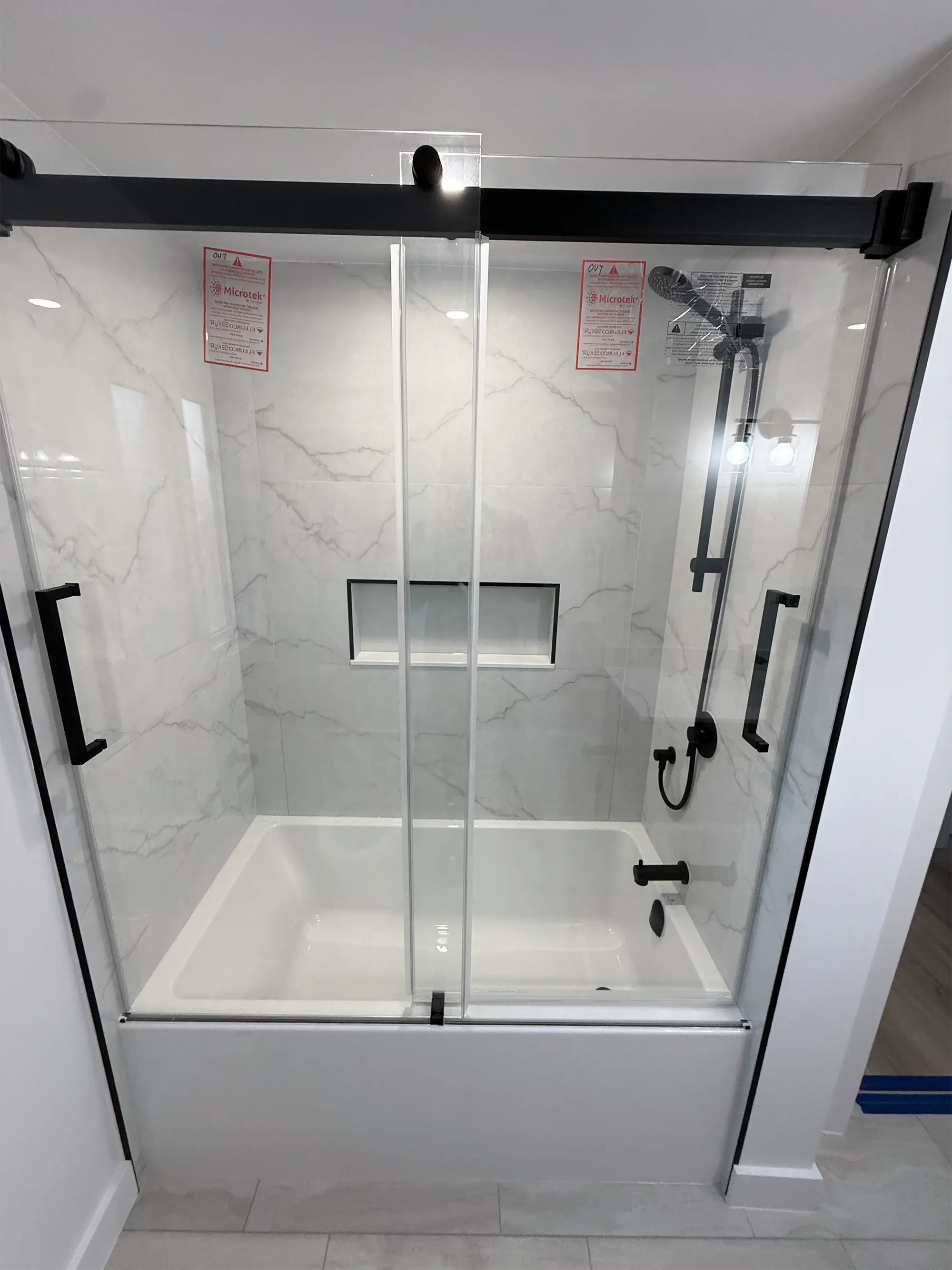 Matte black plumbing fixtures and sliding glass doors provide a bold, contemporary contrast against the light tile, tying the space together with a sleek, modern look.